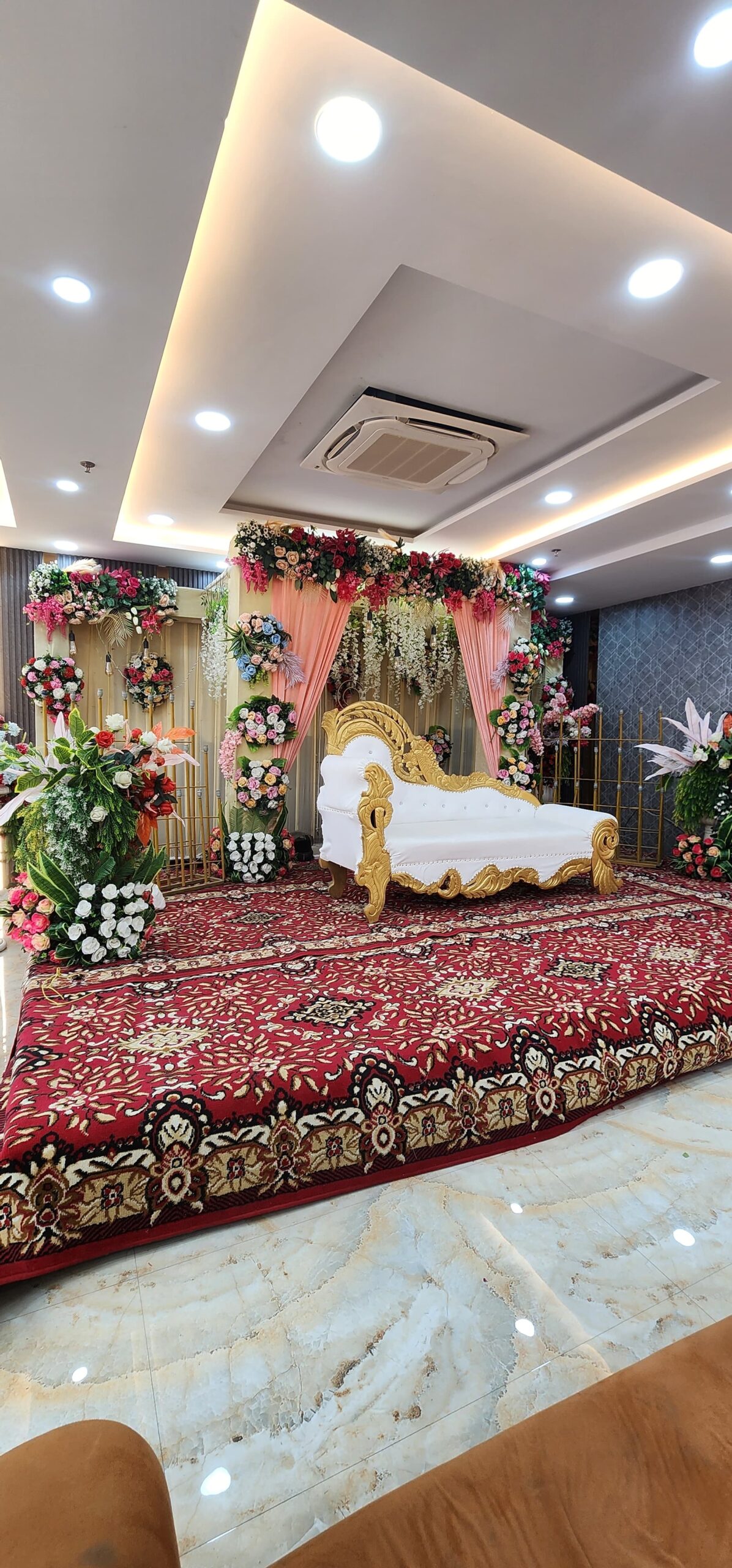 Celebrate your special day in our grand hall, adorned with elegant lighting and décor, perfect for memorable ring ceremonies with loved ones.